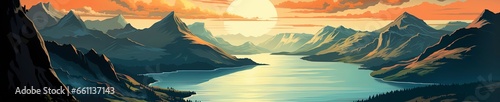 Colorful retro style illustration travel poster of a Scandinavian fjord.