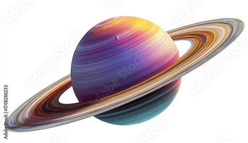 Colorful ringed planet, vibrant hues, swirling bands, rings, celestial body, isolated on white