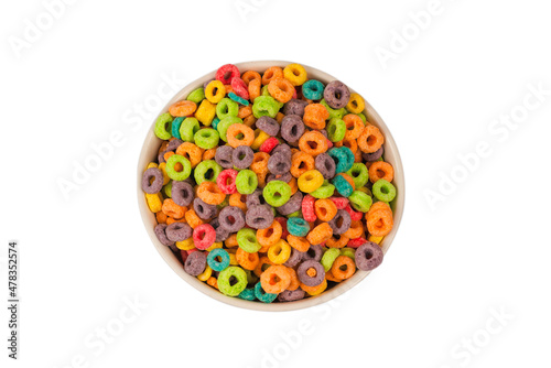 Colorful rings cereal spill out into a bowl. Breakfast. Isolated.