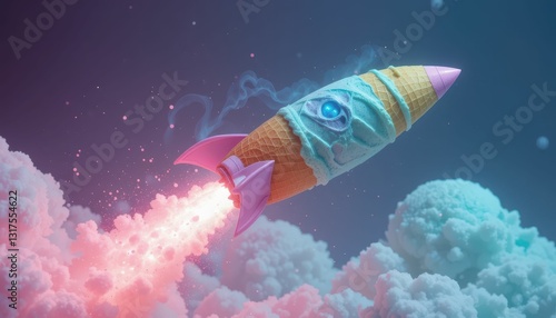 Colorful Rocket Launching Into a Dreamy Cloudy Sky Background