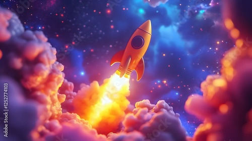 Colorful Rocket Launching Through Cosmic Clouds in Starry Background