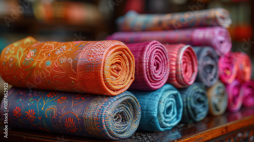 Colorful rolled fabrics display showcasing vibrant patterns and textures