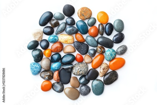 Colorful rounded sea pebbles and sand rocks isolated on white background