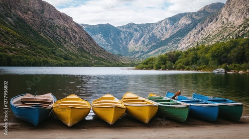Colorful rowboats rest along the shoreline of a mountain lake