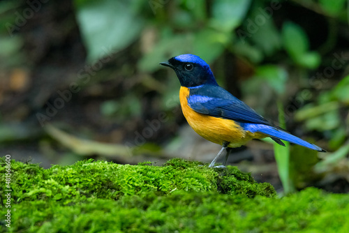 Colorful Rufous-bellied Niltava perching on tree trunk