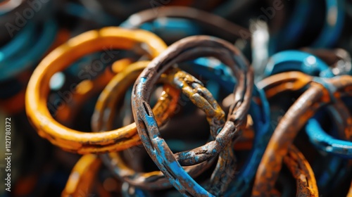 Colorful rusty scrap metal rings showcasing texture and detail in an industrial setting emphasizing recycling and sustainability themes