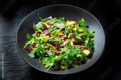 Colorful salad bowl with yellow cherry tomatoes and red cranberries