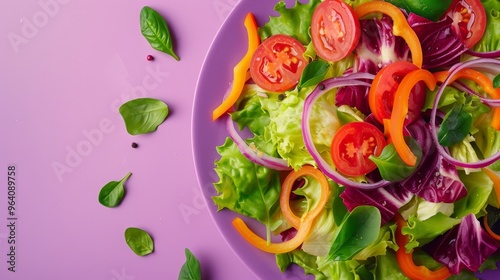 colorful salad with a variety of vegetables on a purple plate, viewed from above, highlighting healthy eating and slimming in a flat lay style