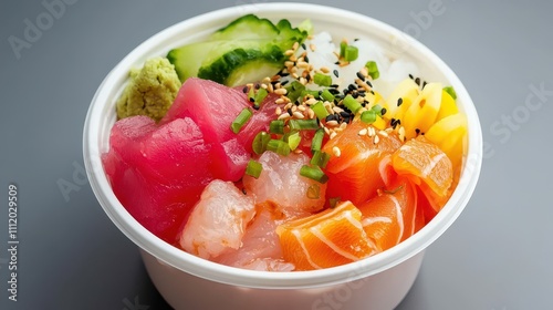 Colorful Sashimi Bowl with Fresh Fish and Vegetables on Gray Surface