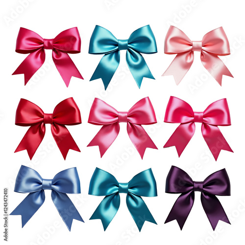 Colorful satin bows in various shades displayed on an isolated white background ideal for crafts and decorations