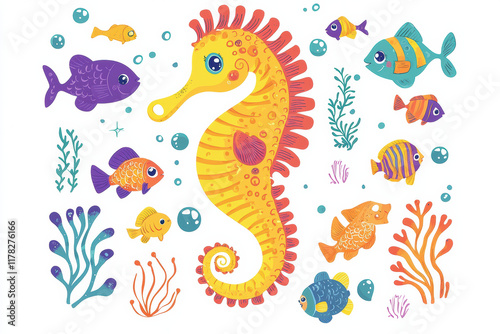 Colorful seahorse surrounded by various fish and underwater plants, creating vibrant ocean scene