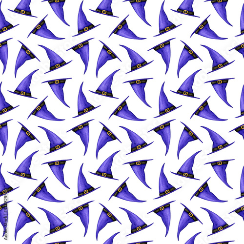 Colorful seamless pattern of watercolor violet witch/wizard hat with black ribbon. Hand drawn background for Halloween, fairy tale, fantasy design, holiday print, wrapping paper, fabric, scrapbooking