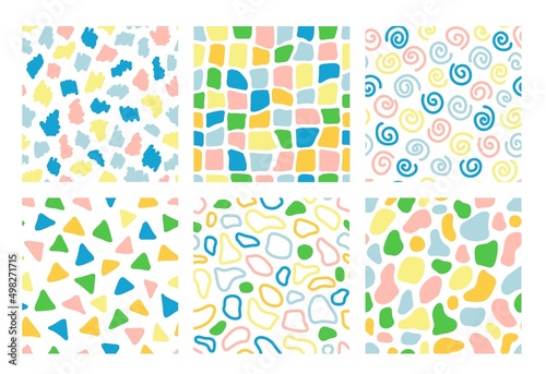Colorful seamless pattern set with hand drawn abstract shapes. Trendy vector background. Fresh modern geo print