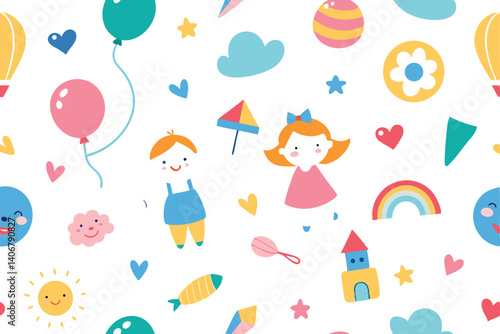 Colorful Seamless Pattern with Kids, Balloons, Rainbows on a White Background