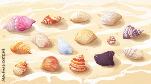 Colorful seashells scattered on a sandy beach with gentle waves in the background.
