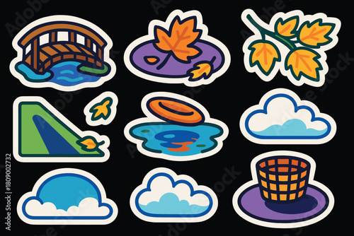 Colorful seasonal sticker set with nature and autumn elements on black background