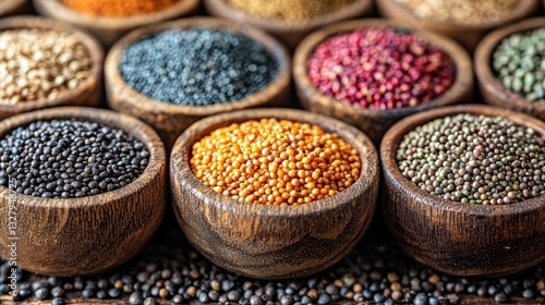 Colorful seeds and grains in wooden bowls.