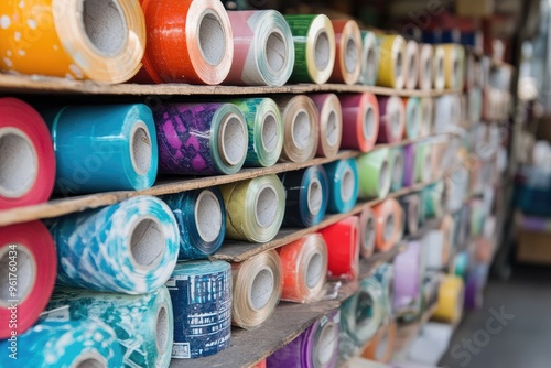 Colorful self-adhesive vinyl flooring rolls on wooden shelves in a hardware store