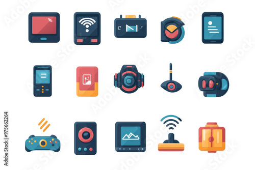 Colorful set of modern technology and gadget icons including smartwatches, cameras, tablets, gaming controllers, and wireless devices.