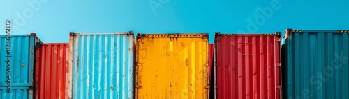 Colorful shipping containers against a blue sky.