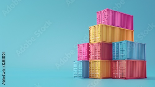 Colorful shipping containers stacked in an organized pyramid against a blue background. Cargo, logistics, import, export, transportation concept.