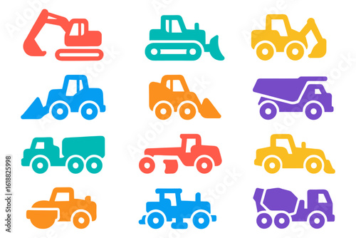 Colorful silhouette construction vehicles set for kids and education