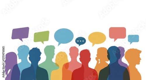 colorful silhouettes, diverse crowd, speech bubbles, communication concept, rainbow colors, social dialogue, community discourse, opinion sharing, vibrant discussion, multicultural group, inclusive co