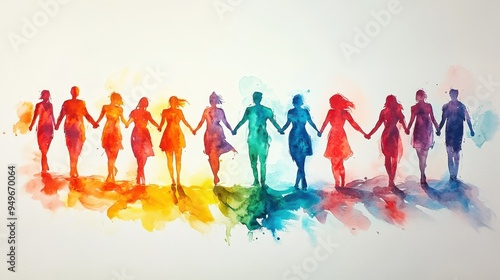 Colorful silhouettes of people holding hands create vibrant scene of unity and togetherness. watercolor effect adds joyful and artistic touch.