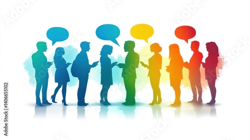 Colorful silhouettes of people talking in a line, with speech bubbles, on a white background
