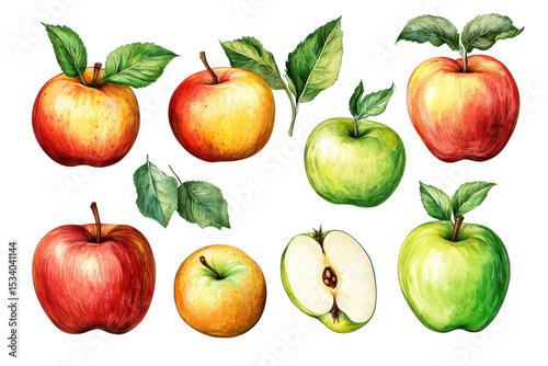 Colorful sketches of apples and leaves showcasing various shapes and shades in a modern artistic style