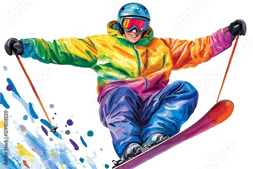 Colorful Skier in Mid-Air Jump, Snow Splash Background