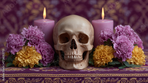 Colorful Skull Altar with Candles for Día de los Muertos Celebration