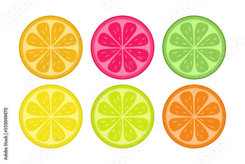 Colorful slices of citrus fruits vector illustrations set. Collection of drawings of orange, yellow, green, pink pieces of fruits isolated on white background. Food, nutrition, diet, summer concept