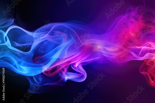 Colorful smoke clouds in neon light swirling on empty scene dark background