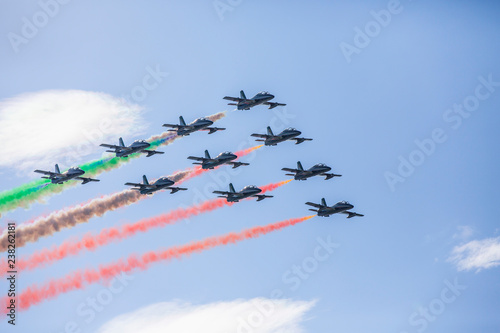 Colorful smoke trails from fleet of planes