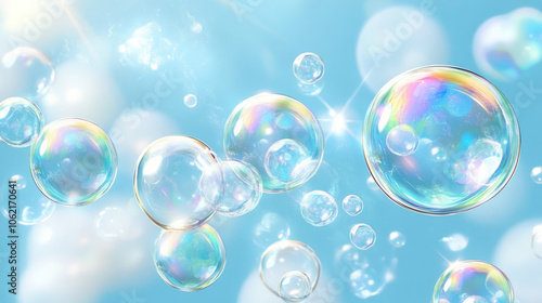 Colorful soap bubbles floating in a bright blue sky on a sunny day