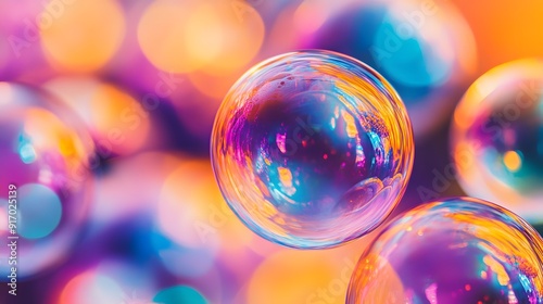 colorful soap bubbles, macro photography, iridescent spheres, water droplets, vibrant colors, orange, blue, pink, yellow, transparent surfaces, blurred background.