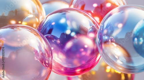 Colorful soap bubbles reflecting light in a playful arrangement, creating a dreamy atmosphere.