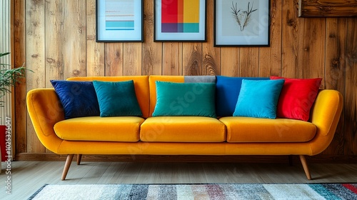 Colorful sofa in a Japandi Scandinavian living room, positioned in front of a wooden wall with decorative art frames.