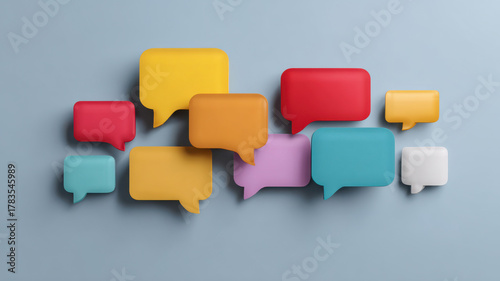 Colorful speech bubbles representing various discussions and ideas against a light blue backdrop. Each bubble is a unique shape and hue, creating a visually engaging composition.