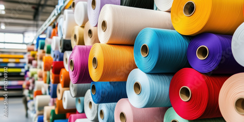 Colorful spools of thread arranged in fabric store, showcasing variety