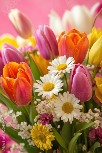 Colorful spring flowers in a bouquet, including tulips and daisies, set against a pink background for Easter or Mother's Day gifts.