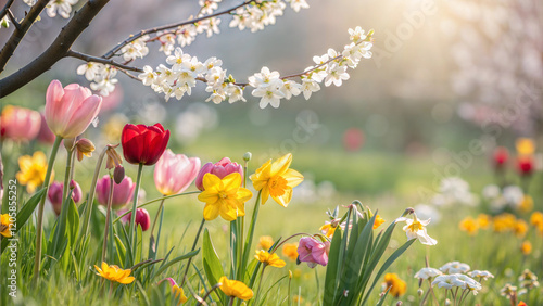 Colorful spring flowers in a sunny field with Easter vibes and cheerful atmosphere