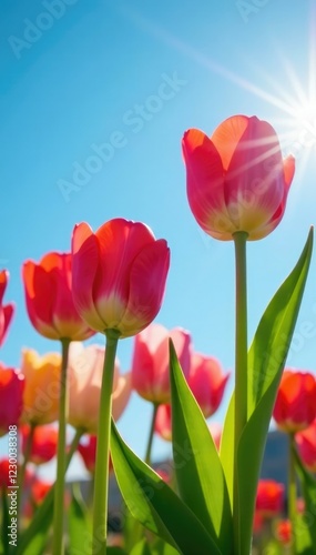 Colorful spring tulips shining brightly against blue sky, colored flowers, tulip