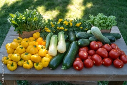 Colorful spring vegetables, including peppers, cucumbers, and tomatoes, are neatly displayed on a rustic wooden table in a sunny outdoor setting. Greenery adds freshness and vibrancy