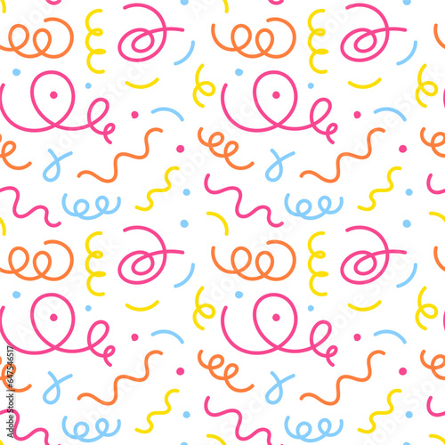 Colorful squiggle fun party seamless pattern. Cute bright elements. doodle background illustration of birthday celebration decoration and childish creative abstract scribbles