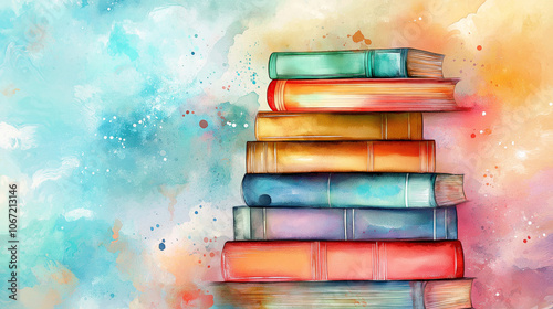 Colorful stack of books in watercolor style with pastel gradient background, symbolizing knowledge, creativity, and lifelong learning for International Day of Education, educational art and reading