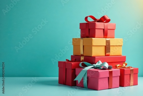 Colorful stack of gift boxes with gold accents and ribbons tied in elegant knots, holiday, ribbon