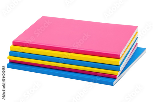Colorful stack of pink, yellow, and blue blank books on transparent background