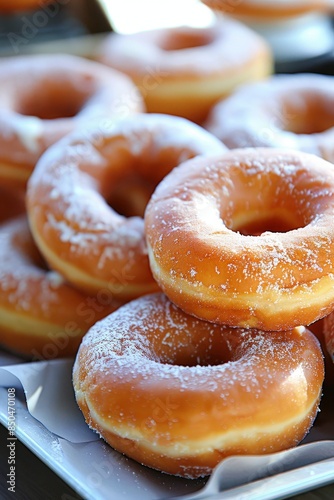 Colorful stack of powdered donuts on plain background, emphasizing shape and color
